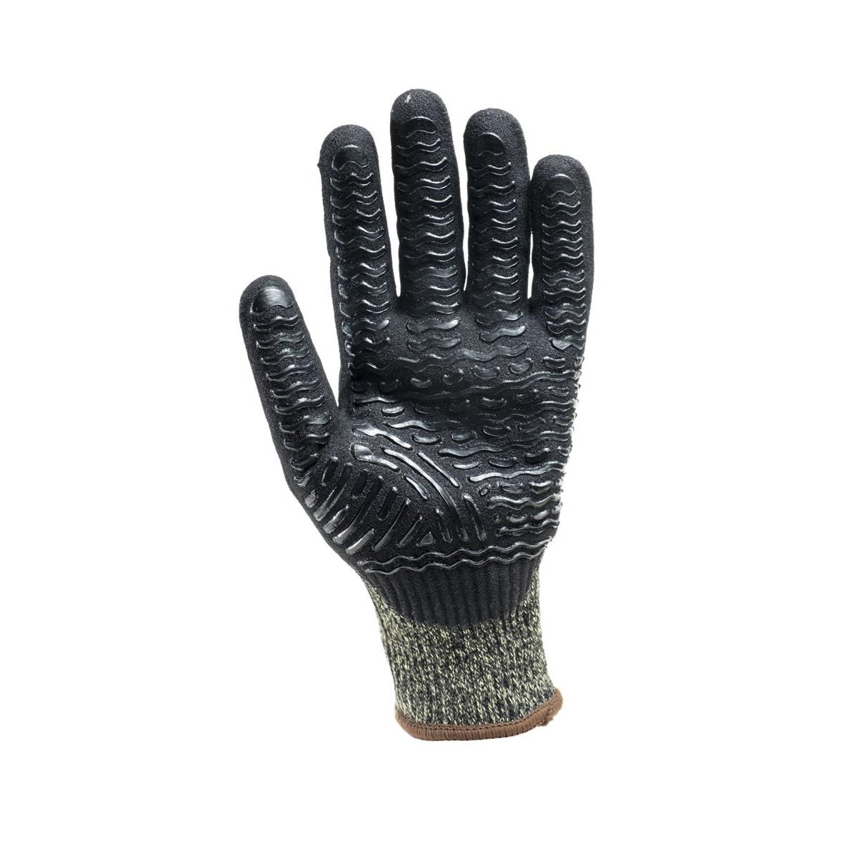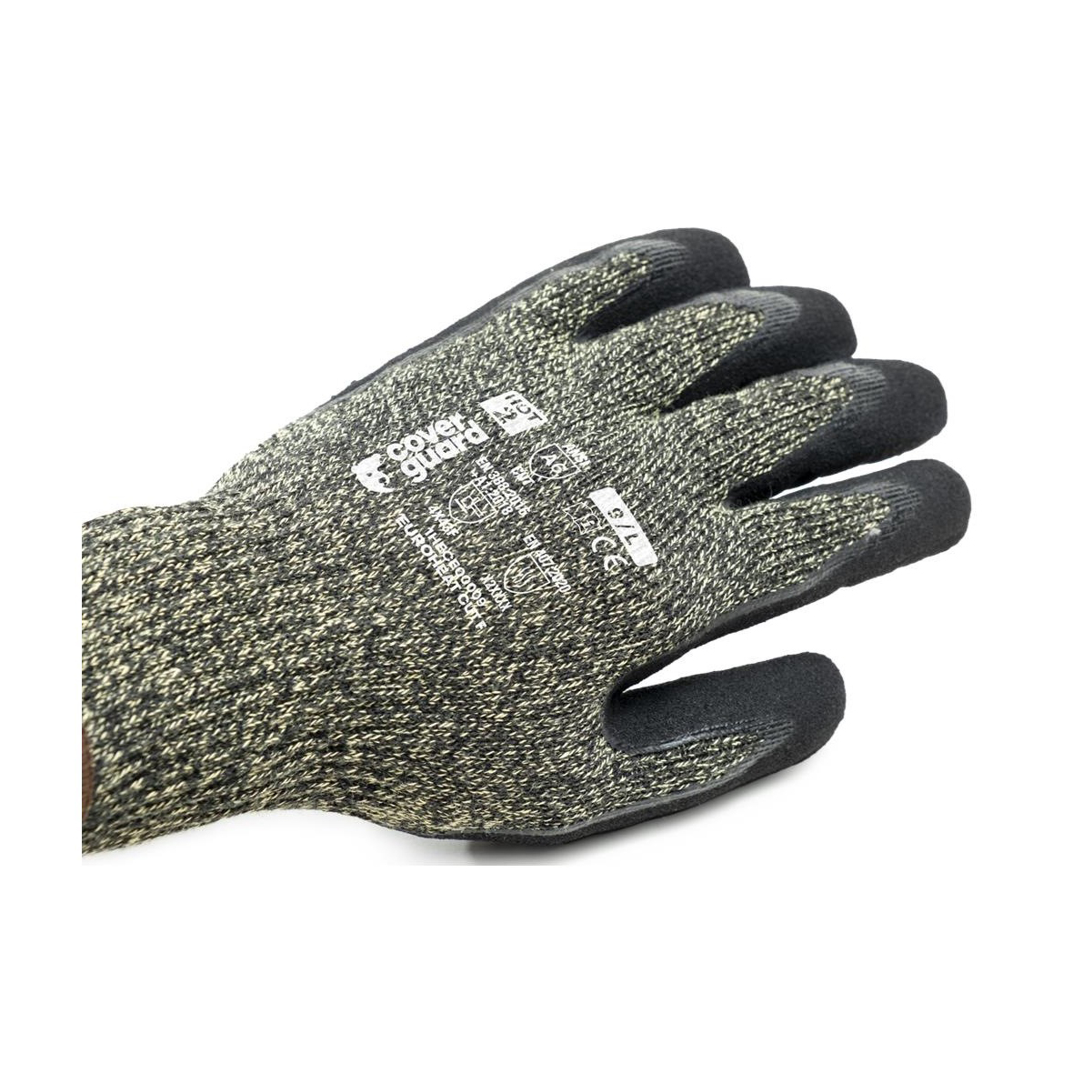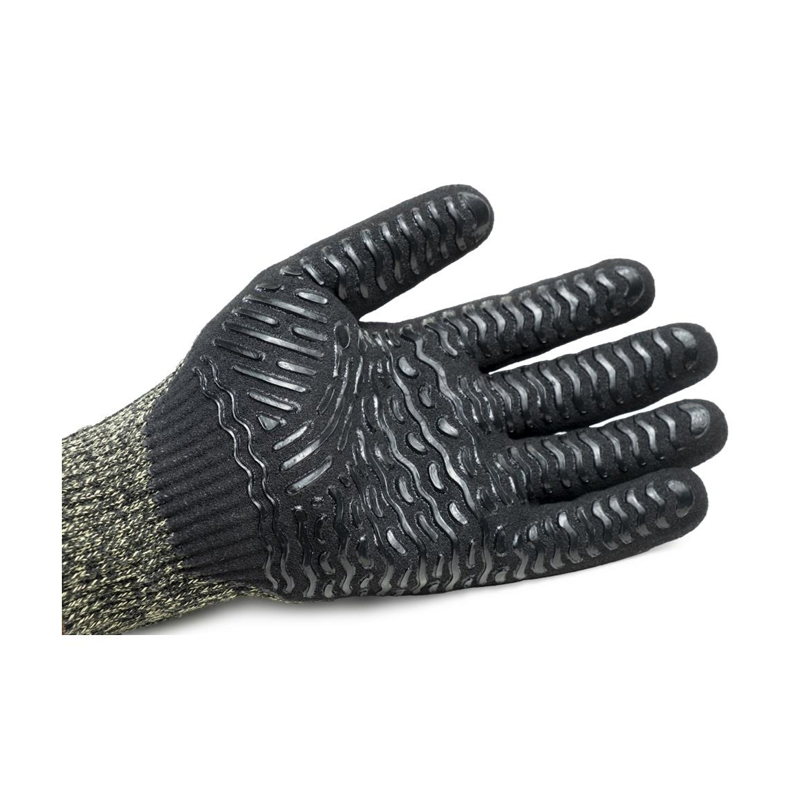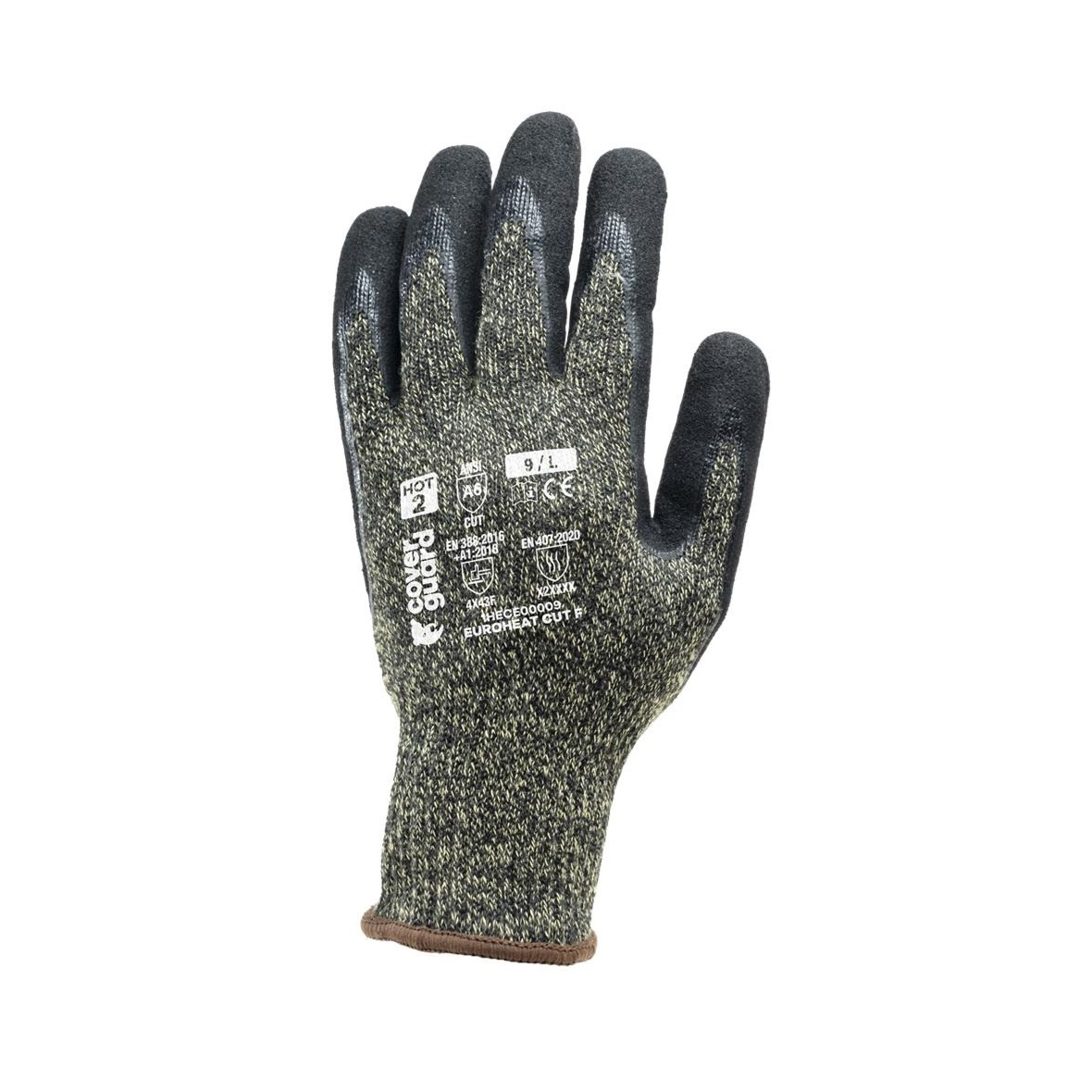 EUROHEAT CUT F 10-es kötésű, varrat nélküli sárga és fekete foltos kötött védőkesztyű, poli-pamut és aramid alapanyagból