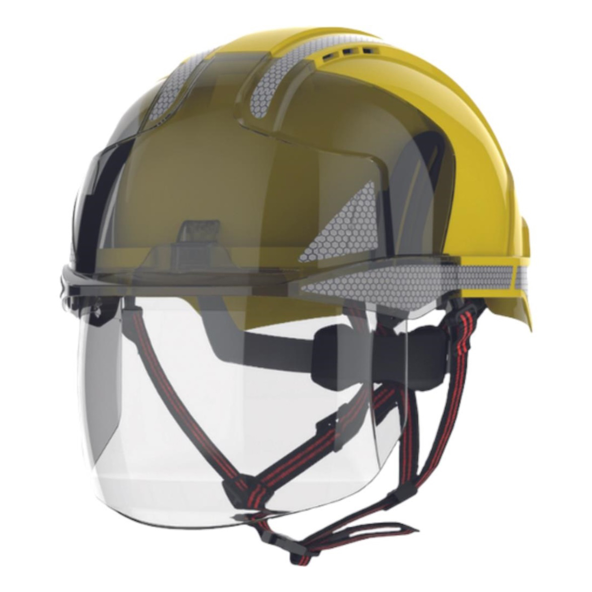Az EVO® VISTAshield® DUALSWITCH™ ötvözi az új EVO® VISTA® visszahúzható sisakszemüveg-technológiát az innovatív DUALSWITCH™ állszíjjal, megkönnyítve a váltást a talajon (EN 397) és a magasban végzett munka (EN 12492) között. EN 397 LD MM -40°C (olvadt fémcseppek ellen, oldalirányú deformációra tesztelve, -40°C° +50°C-ig használható), EN 166 1 AT KN (1. optikai osztály, karcálló bevonat, párásodást gátló réteg, nagy energiájú szemcsék elleni védelem), EN 170 2C-1.2 (UV-sugárzás elleni védelem, magas színfelismerés, víztiszta látómező) EN 50365 1000V-ig elektromosan szigetelő. Éjszakai jólláthatóságot nyújtó matricakészlettel szállítjuk. Szabványok: EN 397 EN 12492 EN 50365 EN 166 EN 170.