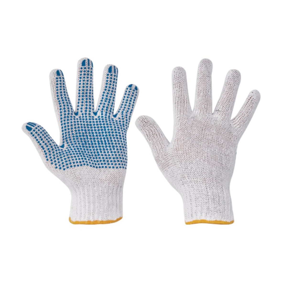 Poliészter/pamut keverékből készült, varratmentes kötött kesztyű PVC-vel pontozott tenyérrel és ujjakkal.