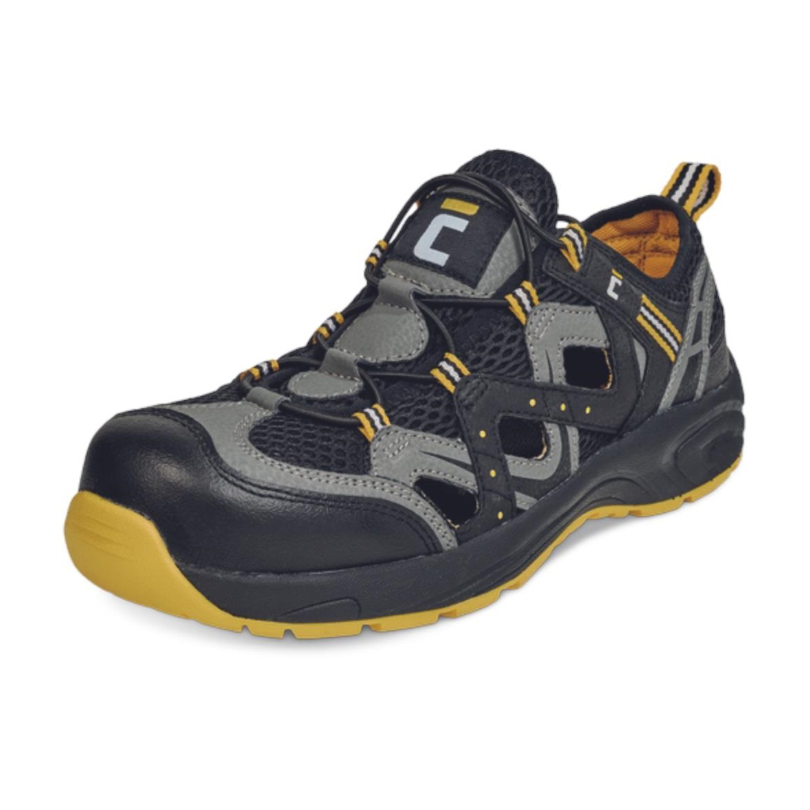 Biztonsági szandál kompozit lábujjvédővel. Antisztatikus, csúszásbiztos phylon/gumi talp, energiaelnyelő sarokkal. Felsőrész bőr és lélegző hálós anyag. Sárga elemek fokozzák a láthatóságát.