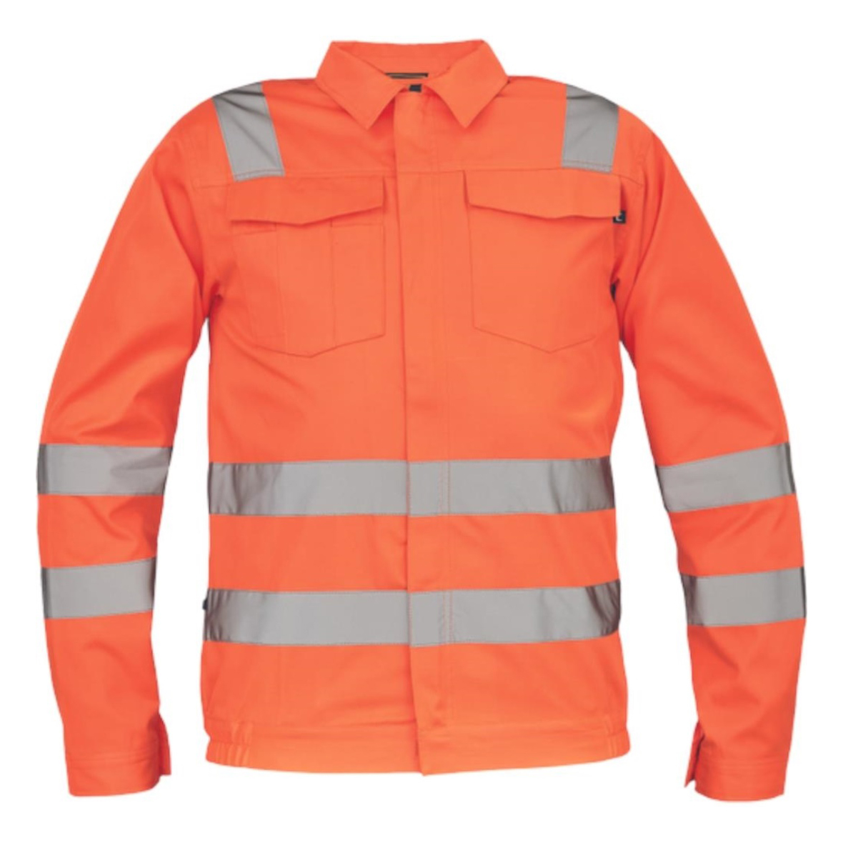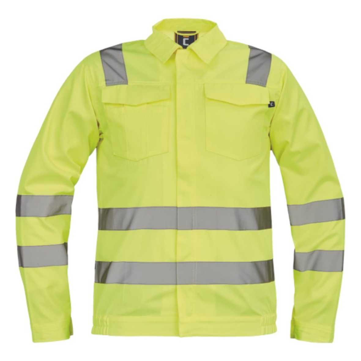 férfi Hi-Vis kabát 5 cm széles fényvisszavető csíkokkal, cipzáras, tépőzáras hajtókával, 2 nagy hajtókás mellkasi zseb, rugalmas oldalsó betétek a kabát alján, tépőzáras mandzsetta