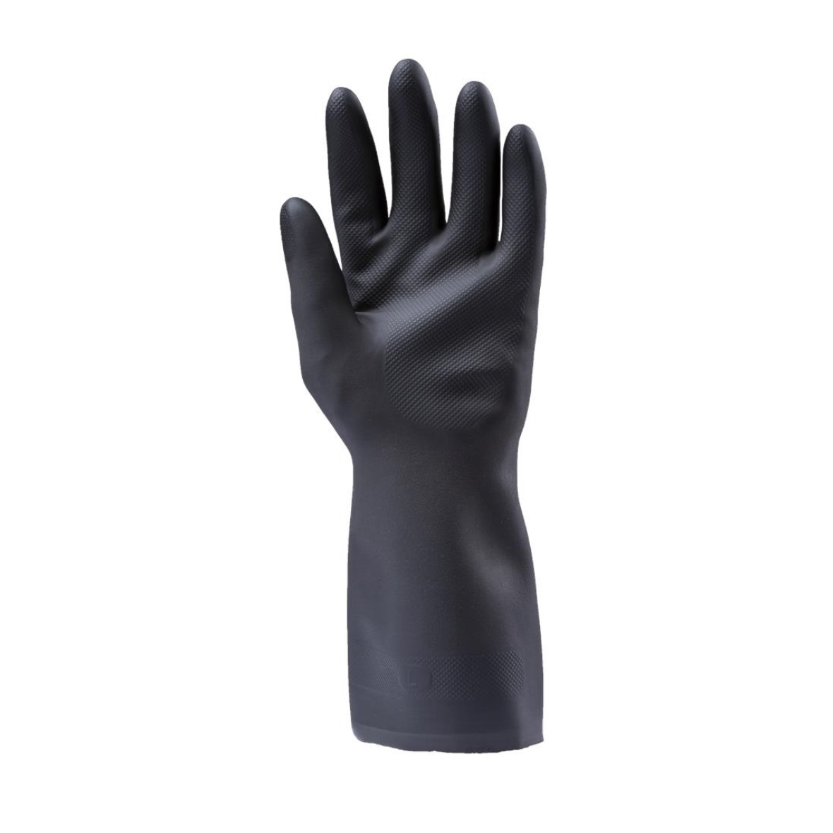 FEKETE POLIKLOROPRÉN ÉS GUMI KESZTYŰ: • fekete polikloroprén és természetes gumi anyag • pamutbolyhozott belső • 0,72 mm vastag, 32 cm hosszú • vegyszerek, mikroorganizmusok ellen véd • csúszás ellen érdesített tenyér • MÉRET: 7-es • CSOMAGOLÁS: 100/10 • EU szabvány: EN420, EN388: 2111, EN374-1, EN374-2, EN374-3: AKL