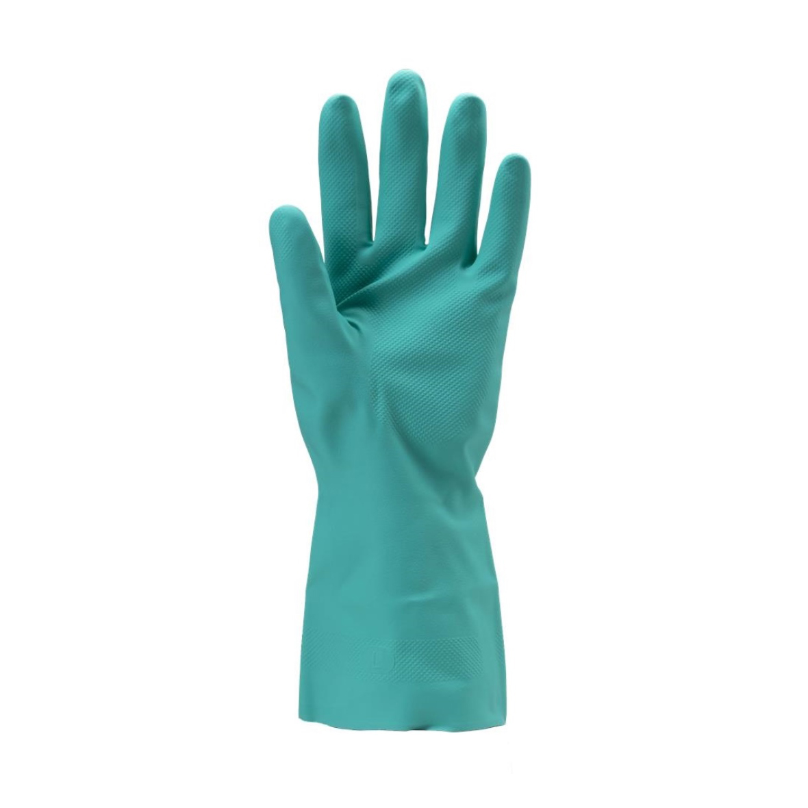 ZÖLD BÉLELT AKRILONITRIL KESZTYŰ 32 CM: • zöld akrilonitril • pamutbolyhozott belső • sav-, lúg-, olaj-, zsír-, és vegyszerálló • mikroorganizmusok elleni védelem • csúszás ellen érdesített tenyér • 0,38 mm vastag, 32 cm hosszú • méret: 7-es • CSOMAGOLÁS: 100/10 • EU szabvány: EN420, EN388: 4002, EN374-1, 374-2, 374-3: AJK
