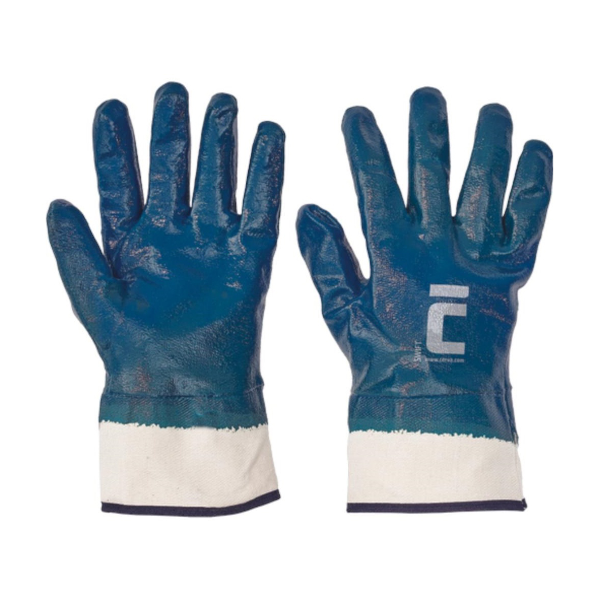 Kötött pamutkelméből varrt, nitrilbe teljesen mártott kék kesztyű merev mandzsettával.