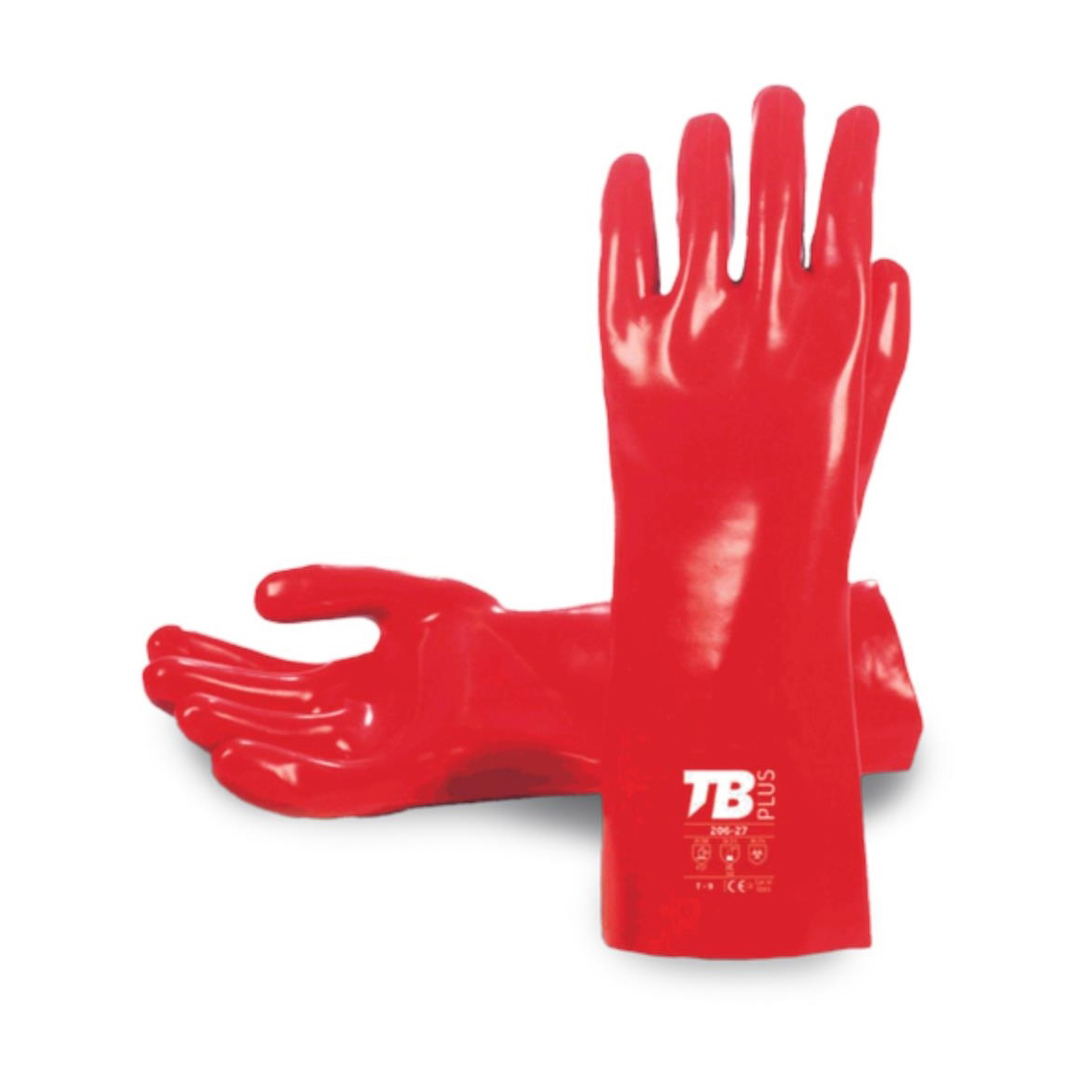 Piros PVC kesztyű pamut béléssel. Vastagság: 1,2-1,4 mm. Teljes hossza: 27 cm.