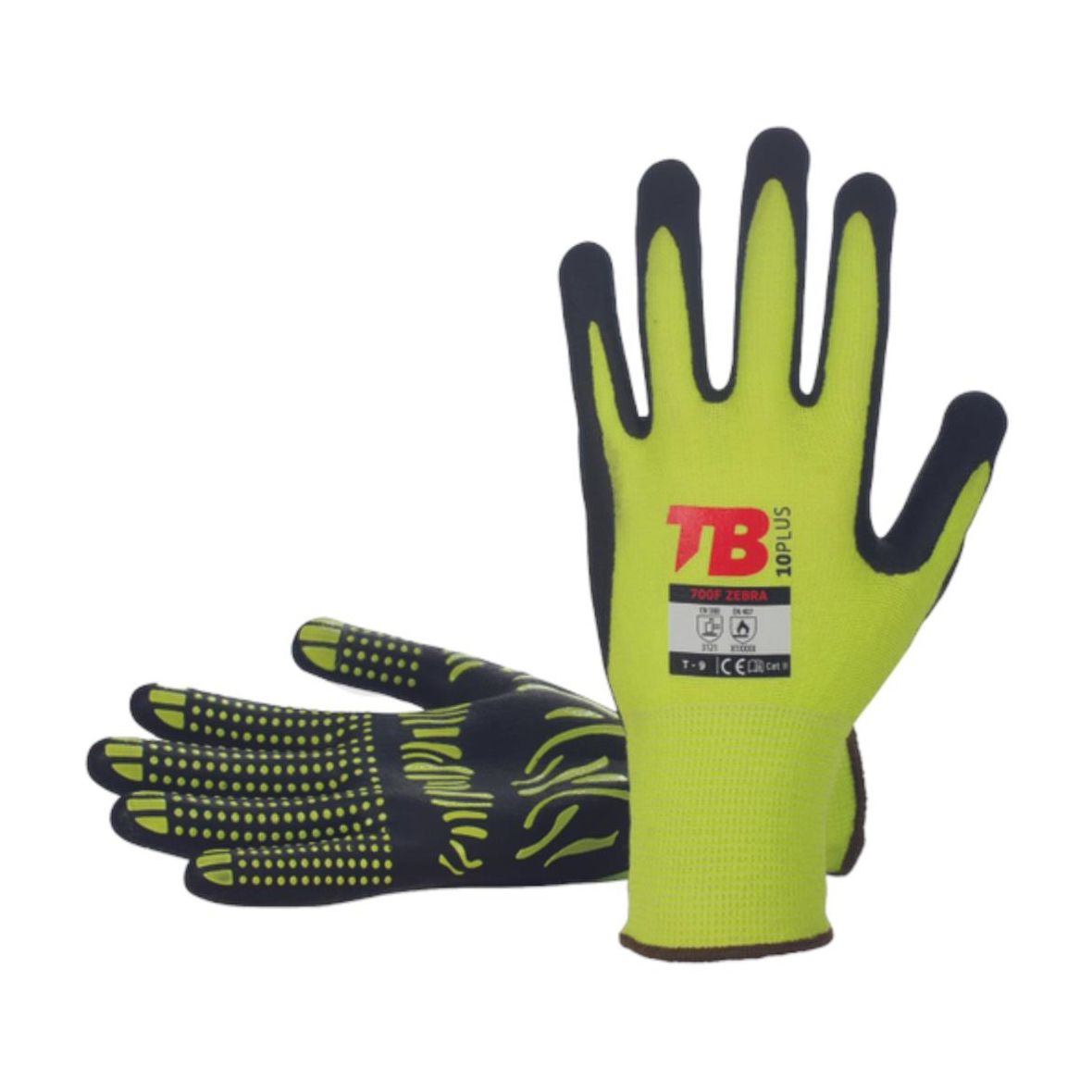 Kötött védőkesztyű pamut/elasztán alapanyagból, Tenyéren habosított nitrilben mártott, sárga PVC pöttyözéssel, tenyéren zebra mintával.