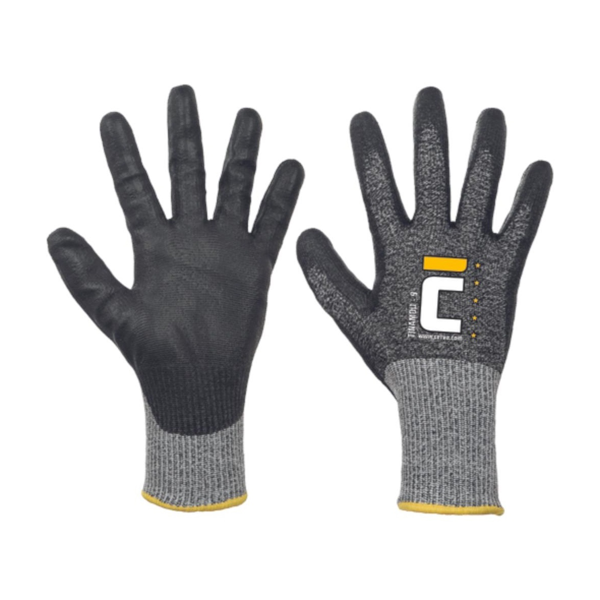 Tenyerén és ujjakon fekete PU-ba mártott varrat nélküli kötött kesztyű, a legmagasabb, F vágásvédelmi szinttel.