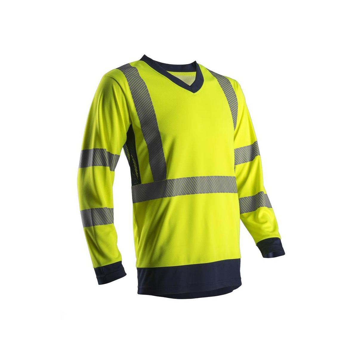 • jól láthatóságot biztosító sárga színű hosszú ujjú póló, sötétkék kontraszt anyaggal • 100% poliészter kopásálló, kiemelten szellőző és alaktartó „Bird Eye” alapanyag • UPF 50+ napfény elleni UV védelemmel • 5 cm széles szaggatott formátumú, szegmentált fényvisszaverő csíkok a könnyebb mozgás és a nagyobb kényelem érdekében: 1 mellrészen, 2 a vállon és 2 a karokon • egyenes vonalú szabás, a hónaljánál hálós betét biztosítja a kiváló szellőzést • fekete V-nyakas gallér • 60°C-on 30 alakalommal mosható • MÉRET: L